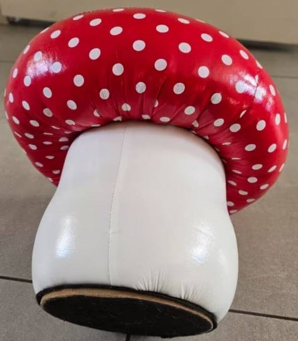 Paddestoel krukje / Poefje. Stevige kruk met kunststof bekleding en houten frame.Rood met witte stippen zat kabouter Spillebeen heen en weer te wippen.....